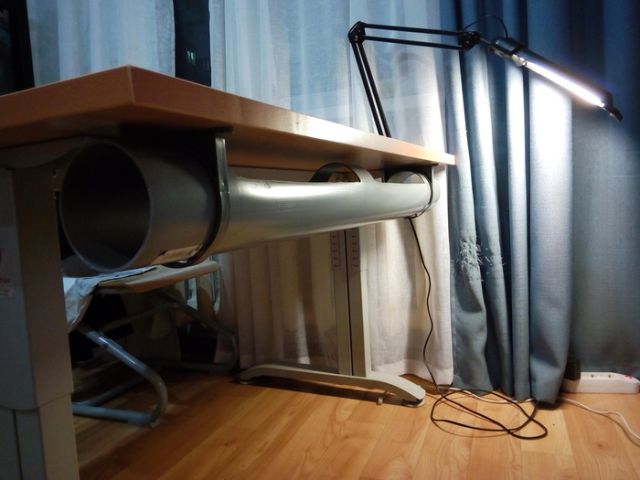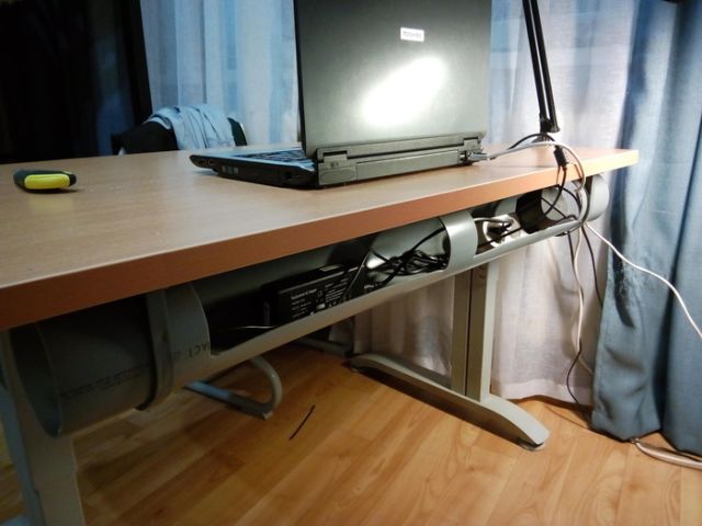 Теперь только что и осталось как закрепить трубу к столешнице. При этом туда можно собрать не только провода, но и небольшие блоки питания, хабы и все в таком роде.
