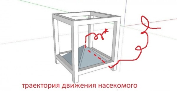 Вначале о принципе работы такой ловушки. Мухи и осы насекомые не разумные, а именно на этом принципе и будет основан работы ловушки. Эти насекомые способны сбиваться в углы, по среднестатистической своей траектории полета. Это значит, что ловушка должна быть построена так, что вход должен быть где-то в углу, а выход совсем не в нем.