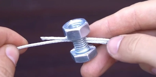 Итак, у нас есть металлический тросик. Его необходимо будет закрепить петлей или просто поставить фиксатор, чтобы он не расходился на краю. Как же можно решить эту проблему быстро и с помощью того, что есть под рукой. А под рукой у нас должен оказаться обычный болт и гайка на него. Смотрим.