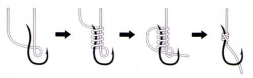 Первый пример самый распространенный, самый простой. С него и начнем. Здесь надо будет продеть леску в петлю, потом обмотать эту леску вокруг ножки крючка раз 5-7 и натягивая продеть обратно в ушко.