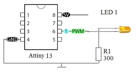 Здесь можно даже ничего не рисовать, то есть не приводить рисунка и схемы, ведь надо нам будет 3 ножки. 4 и 8 питание, и 6 ножка физическая или 1 программная, это у нас выход на светодиод, который желательно подключать через ограничивающий резистор порядка 300 Ом.