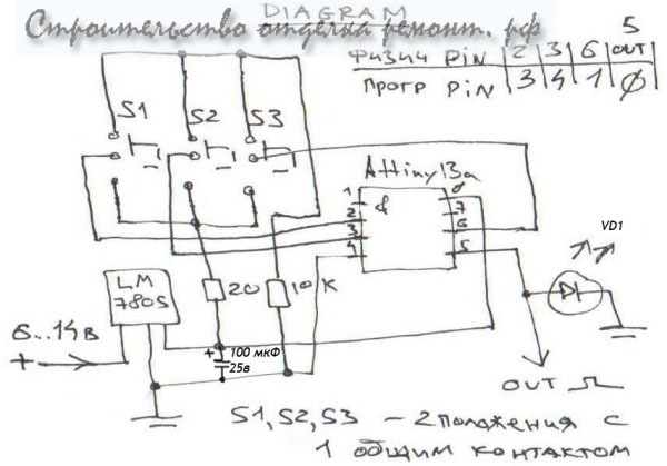 Схема нарисована на листочке бумаги и отсканена, но мне кажется туту все понятно. Так вот, на схеме есть табличка. Табличка с обозначением физических ножек и их программным значением. Эти пины можно сопоставить как раз по таблице. То есть при программировании микроконтроллера, надо учитывать, что то, что в программе, не совсем соответствует физическим выводам микросхемы. Чтобы как раз перевести одно в другое и была сделана эта табличка.