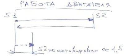 Если вам задержка не нужна, то схема будет выглядеть само собой вот так. Здесь нет таймера, а также переставлен и заменен конечный датчик S2. Он теперь стал нормально замкнутый. При этой схеме каретка будет ходить туда-обратно до бесконечности, пока вы не отключите схему или что-нибудь не сломается.
