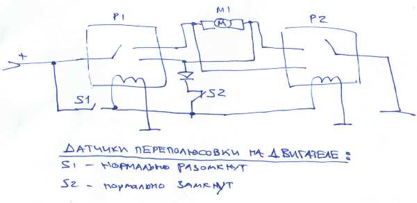 Теперь о самой схеме. Здесь применено 3 реле, при этом два из них (Р1 и Р2) отвечают за переключение напряжения питания, то есть за переполюсовку питания, а третье реле шунтирует концевой датчик старта в течение 1,5 минут за счет работы таймера. За это время каретка успевает отойти, таймер и реле отключаются, но при этом замыкается датчик старта, за счет этого и продолжает подаваться питание на двигатель каретки. Как замыкается выключатель реверса, реле включаются, на двигатель подается обратная полярность. Реле самоподхватываются через диод. В итоге двигатель гонит каретку в обратном направлении до датчика старта, который теперь будет датчиком финиша. Диод нужен чтобы не допустить КЗ пока когда будет нажат датчика реверса. Таким образом, собственно и реализуется тот самый цикл, который мы рассмотрели выше.