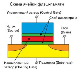 В итоге получается так, основной затвор служит для выборки ячейки памяти среди нескольких ячеек, подключенных к одной линии данных, а уровень заряда на изолированном затворе определяет состояние ячейки памяти.