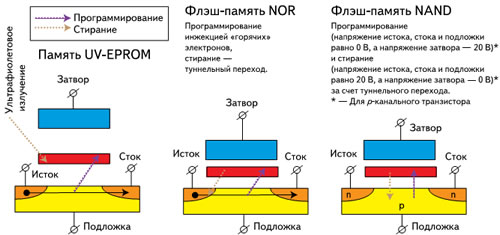 Тот или другой выбор определенные ограничения на технологию: в архитектуре NOR для программирования обычно используется процесс инжекции «горячих» электронов (hot-electron injection), а для стирания — механизм туннельного перехода Фаулера-Нордхейма (Fowler-Nordheim tunneling).
