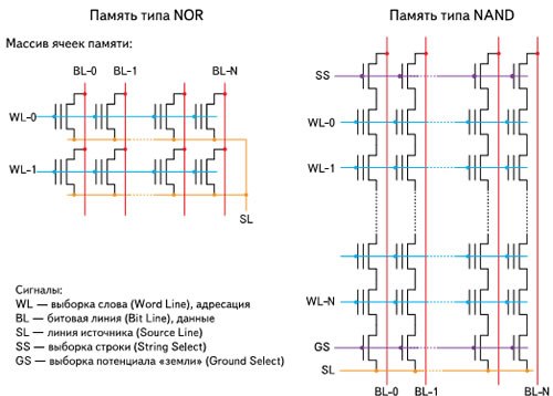 Флэш-память типа NOR похожа на обычную оперативную память, так как обладает внешним интерфейсом с произвольным доступом по шинам адреса и данных, а память типа NAND больше напоминает дисковый накопитель с блочным доступом SSD. Причем при существенно большей скорости чтения данных память NOR имеет значительно меньшую скорость стирания и несколько меньшую скорость записи в сравнении с NAND. Однако память NOR позволяет исполнять записанный код, а программы из NAND перед исполнением всегда приходится перегружать в оперативную память. Ячейка флэшпамяти NAND имеет значительно меньшие размеры в сравнении с памятью NOR. Между тем, при прочих равных условиях ячейка памяти NOR занимает на кристалле площадь 10F2 , а ячейка памяти NAND — 4F2.