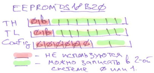 Кроме того, у DS18B20 есть EEPROM (независимая энергонезависимая память) объёмом 3 байта (24 бита), куда записываются: