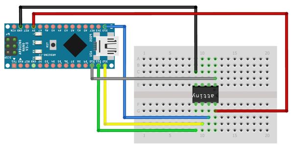 Собственно на этой картинке показано даже как подключается Ардуино к Аттини во время ее программирования. Смотрите синие метки.