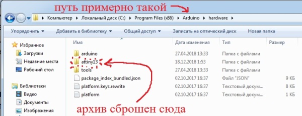 Для этого необходимо расширить список плат, дополнив штатную папку hardware архивом attiny13. Опять же для наглядности картиночку оставляю, где это все находится и куда разархивировать скачанный архив.