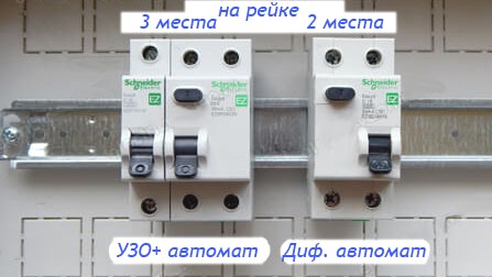 Начну с визуальной разницы и размеров. Если щиток ограничен по установочным местам на планке, то полный дифавтомат будет вроде как предпочтительней, так как занимает в полтора раза меньше места! В качестве примера можно привести пару фото, где 3 дифференциальных автомата занимают всего лишь 6 мест на рейке, вместо 9, когда используется парно автомат и УЗО (дифференциальный автомат по утечке тока).