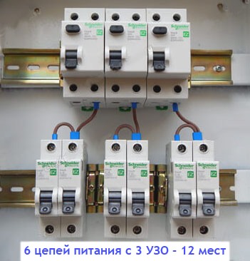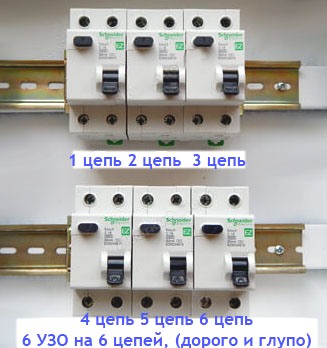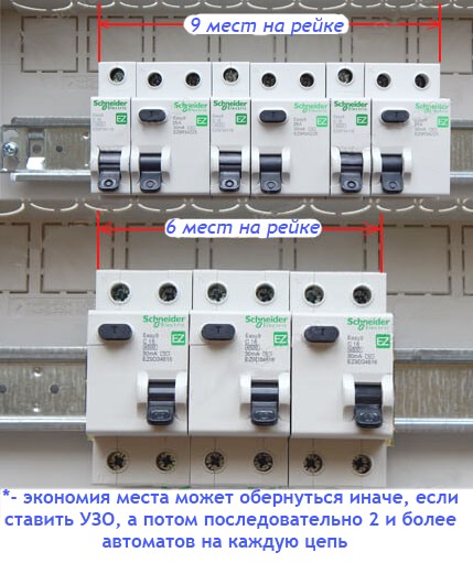 ...если скажем на одно УЗО "повесить" сразу три автомата, то мы уже экономим 4 места на двух УЗО. В итоге получаем 5 мест против 6!
