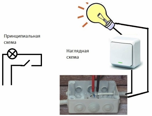 Прежде всего, необходимо понять основное, а потом из него извлечь нужное. Так поступим и мы, приведя схему для однокнопочного выключателя. Фактически здесь все максимально просто. Имеется участок сети с питанием, в состав которого входит лампочка и выключатель. Так выключатель замыкает этот участок сети, в итоге пропуская по нему ток. Вследствие этого ток протекает по участку через провода от распределительной коробки (счетчика), далее по проводу до выключателя, через него, после по проводу до лампочки, через нее, ну и в итоге по проводу до распределительной коробки, с которой все и начиналось. Здесь надо усвоить два принципа. Первый, это то, что ток появляется только в случае появления замкнутого участка сети, а второе, замкнутый участок сети обеспечивается выключателем, который и является управляющим элементом в ней.