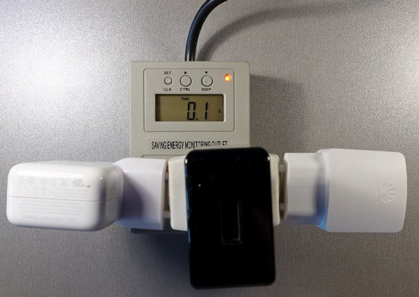 Итак, у каждого дома наверняка имеется зарядное устройство, да еще и не одно. Часто оно просто постоянно включено в розетку, так оно и на месте и в целом удобно. Но ведь в этом случае зарядка потребляет некую мощность, пусть и незначительную, ведь по факту оно находится в режиме ожидания. Насколько много этой самой мощности отбирает зарядное устройство из сети!? Если использовать для измерения фильтр с мониторингом потребляемой мощности, с включенным 1 зарядным устройством, то это 0 Вт. Хотя конечно на счет 0 мы точно погорячились.