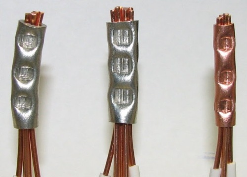 Плюсы простота соединения, выполнение требований ПЭУ, не требуется электроинструмент, возможность соединять провода из разных материалов. Спобоб вполне приемлем и часто используется частными мастерами - электриками, о чем мы уже говорили. К минусу можно отнести необходимость в обжимнике, и наличие точечных контактов, а не по всей поверхности соединения проводников, как при пайке.