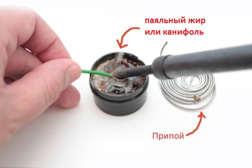 Далее разогреваем паяльник, обычно это 5-7 минут. Греем скрутку, чтобы она равномерно прогрелась, и макаем ее в этот самый паяльный жир.