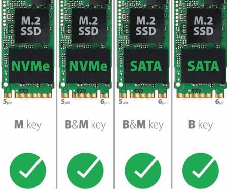 Оба типа накопителей используют разъем M.2, однако отличаются типом подключения. M.2 SATA подключается к контроллеру SATA, используя традиционный протокол, что ограничивает его пропускную способность до 6 Гбит/с. С другой стороны, M.2 NVMe подключается напрямую к процессору через PCIe, что позволяет достичь пропускной способности до 32 Гбит/с для PCIe 3.0 и до 64 Гбит/с для PCIe 4.0.