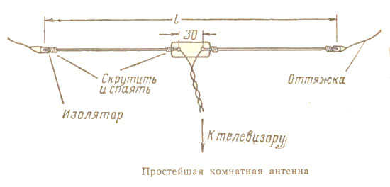 Напряжение магнитных волн в помещении гораздо меньше, чем снаружи. Поэтому комнатные антенны есть смысл применять лишь в непосредственной близости от телецентра. Так простейшую комнатную антенну можно сделать из электрического провода, либо любого другого изолированного проводника. По центру антенны устанавливается изолятор. К нему посредством крепежа (болт - гайка) крепиться два проводника. Концы проводников растянуты таким образом, чтобы они были прямые, словно струны или стержни.