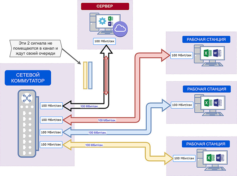 Когда у нас на сервере хранится много данных и три компьютера одновременно обращаются к нему за информацией со своей максимальной скоростью 100 Мбит/сек., получается поток из 300 Мбит/сек. И если гнездо нашего сервера 100 Мбит/сек., то сервер будет работать с ними либо по очереди, либо просто в три раза дольше будет передавать все данные, предоставляя каждому коридор в 33 Мбит/сек.