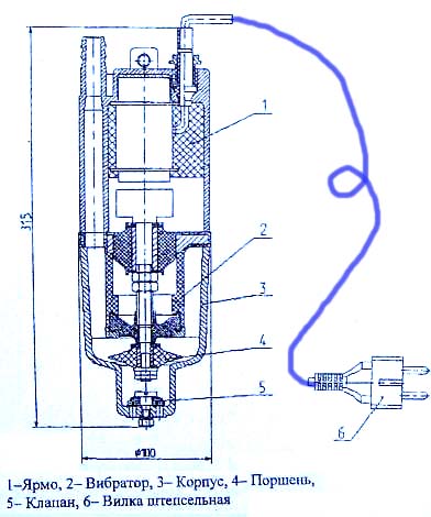 Ни для кого не будет секретом принцип работы вибрационного насоса. По сути это мембрана (4) и клапан (5). Происходят поступательно возвратные движения, колебания, тем самым захватывается вода в корпус, через клапан, через поршень и вода вытесняется вверх по насосно-компрессорной трубе.