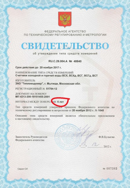 Перед походом в УК я основательно подготовился, прошерстил форумы, почитал мнения умных людей и вот что выяснил. В далеком 2004 году Правительство Москвы выпустило постановление 77-ПП, допускающее устанавливать в жилищном фонде города счетчики воды с МПИ не менее 4 лет для горячей воды и 6 лет для холодной. Видимо, подавляющее большинство счетчиков на рынке имели характеристики, удовлетворяющие этим условиям, и на паспорта приборов смотреть перестали, а стали лепить заветные 4 и 6 во все акты. Данное действие показалось мне не вполне логичным и не совсем законным. Мой же счетчик горячей воды имеет МПИ 6лет. Кстати, проверить МПИ на любые приборы учета, зарегистрированные в РФ (неважно воды, тепла, электричества) можно на сайте Федерального информационного фонда по обеспечению единства измерений. Открываем раздел «Сведения об утвержденных типах средств измерений» и ищем наш прибор по типу, наименованию или изготовителю.
