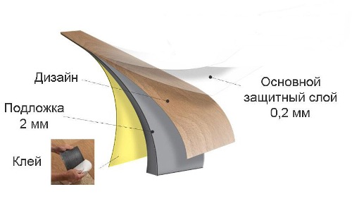 Начнем с верхнего слоя. Верхний слой это прозрачная защитная пленка, которую вроде как не видно, но она делает свое дело. Ее стойкость к истиранию долго и надежно сохраняет рисунок и цвет.