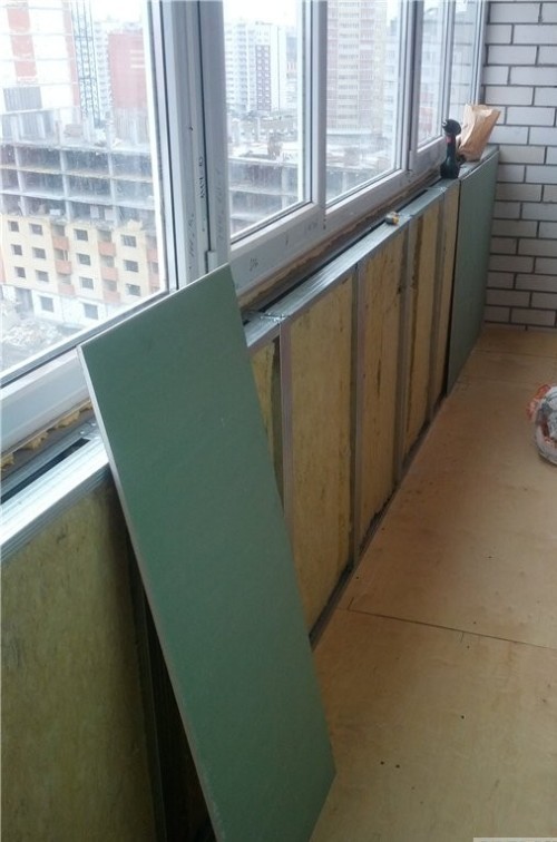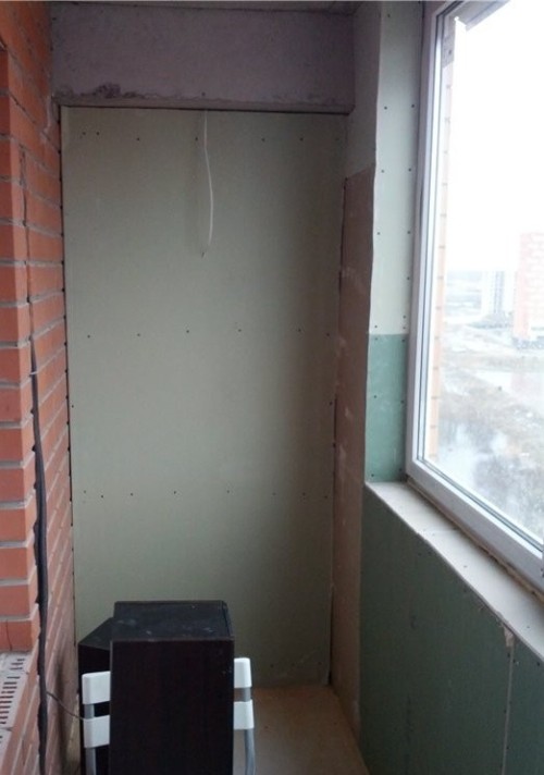 Зашиваем стенки на лоджии (балконе) влагостойким гипсокартоном. Дело в том, что лоджия или балкон место подверженное образованию конденсата, именно поэтому применение влагостойкого гипсокартона будет оправдано. Крепить к металлическому профилю листы гипсокартона можно специализированными саморезами. Более подробно о саморезах можно узнать из статьи "Саморезы"