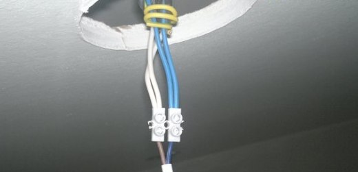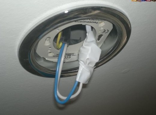 Теперь необходимо найти под потолком электрические провода, которые вы должны били пробросить при монтаже потолка, либо проложить их сейчас, если это возможно. Изолируем соединения.