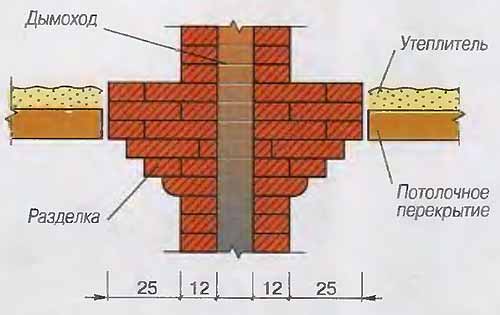 Так вот, в этой статье мы приведем схему кладки печной трубы для потолочного перекрытия, в некоторых случаях такая кладка еще называется разделкой.