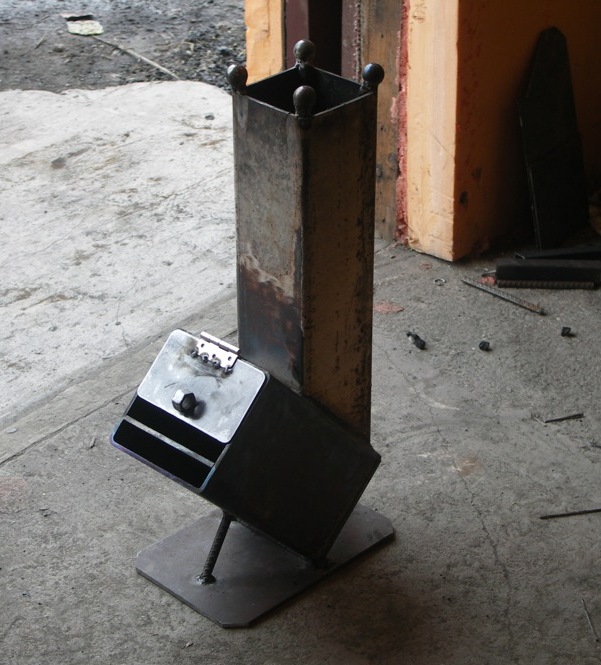 На самом деле в таком конструкторском решении, когда тепло отбирается из тяговой трубы есть свое разумное решение. Ведь самый жар в простых печах зачастую улетает в небо, то есть в никуда, что свойственно для банных печей, печей буржуек, когда в печи не применена система колодцев. В этом же случае, то есть в ракетной печи, место для подогрева расположено сразу над трубой. В итоге, самые горячие газы омывают своим потоком место нагрева, тем самым значительно повышая КПД печки. После того как мы разобрались с конструктивными особенностями, приступим к частному примеру изготовления ракетной печки своими руками.