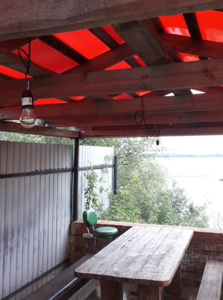 Крыша уже с поликорбонатом и есть проводка под освещение! В целом предстоит еще много что сделать, дабы придать беседке красивый эстетичный вид, однако капитальное строительство на этом заканчивается.