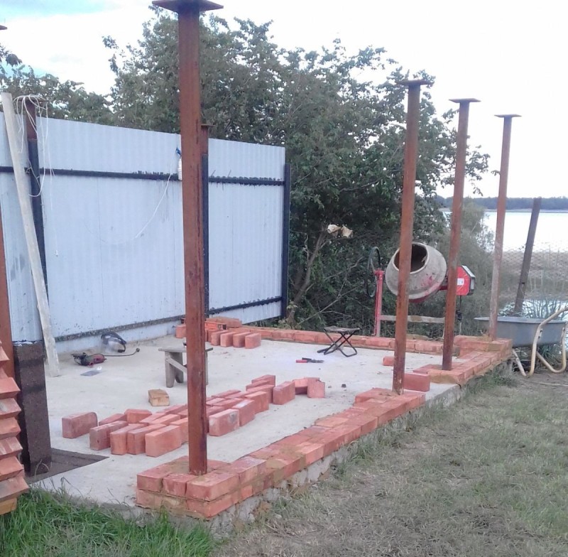 Итак, в качестве опор необходима будет квадрат труба. Трубу можно взять такую, чтобы она входила в отверстие, если выкладывать кирпичи по замкнутому контуру. То есть если кирпич длиной 250 мм а ширина 120 мм, стандартные размеры, то отверстие получается примерно 130 мм. То есть перем трубу с размерами стенок до 130 мм или диаметром до 130 мм. А в целом конечно надо ориентироваться на прочность конструкции. Как мне видится, труба 50*50 со стенкой 3 будет наиболее подходящей, если за нее все же надо будет платить деньги, то есть с оптимальным соотношением цена, качество.