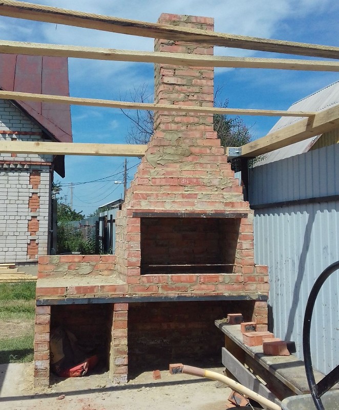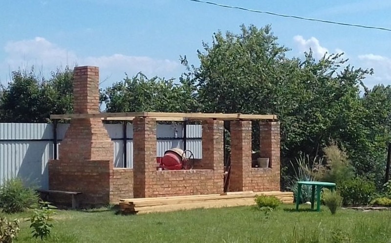 Ну что же начну по порядку рассказывать о беседке. Само собой для ее изготовления понадобятся материалы. В нашем случае беседка будет сделана из металла, он будет использован для опорных конструкций. Из кирпича для стен и облицовки труб. Также кирпич пойдет и на мангал. Потребуются доски на стропила, поликорбонат в качестве кровли. Ну и конечно же песок и цемент.
