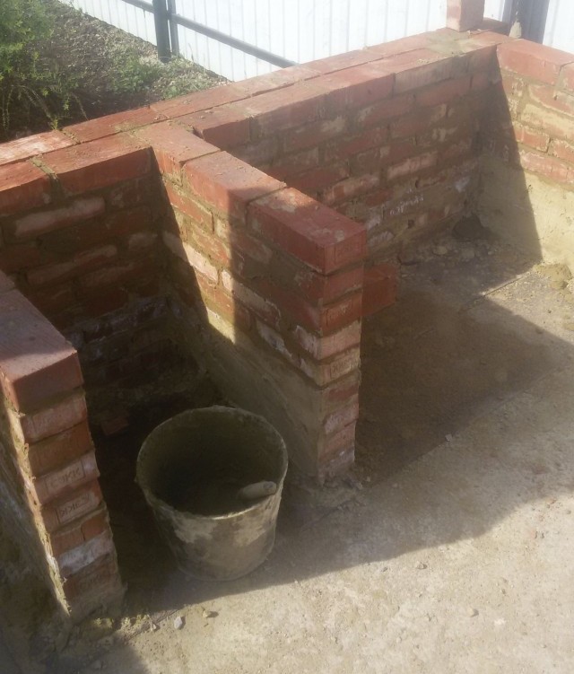 Начинаем делать мангал. В качестве конкретных примеров тоже хотелось бы предложить свой вариант мангала из кирпича. Хотя то, что получается конкретно в этой беседке, больше тянет уже на целую плиту.