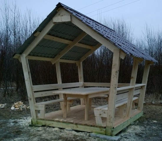 Такой вид беседки наиболее распространен. Ее часто предлагают к продаже на различных строительных рынках. Это вариант, когда у вас есть навес над головой, на стенках крепяться скамейки, посредине стоит стол, а с торцов имеются два захода (выхода).
