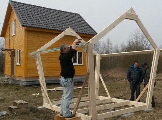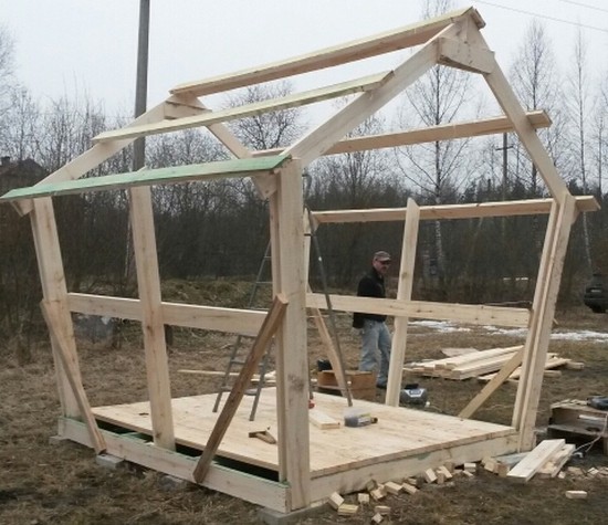 Затем закрепляются стропила, которые ложатся на наружную обвязку столбов. Закрепляются с помощью гвоздей и шурупов.