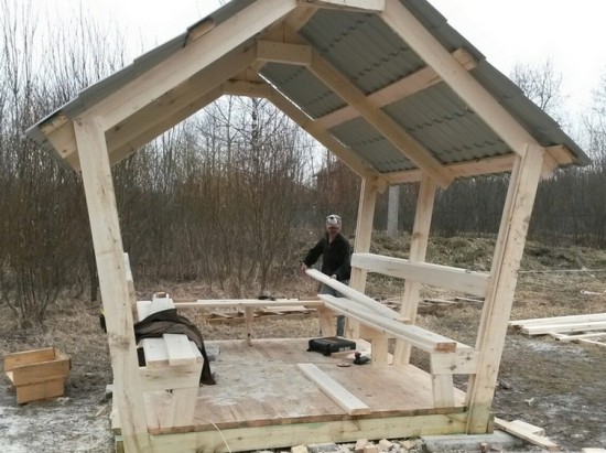 Все поверхности необходимо обработать морилкой или другие влагоотталкивающим составом. Это можно сделать как по мере строительства беседки, так и после завершения ее строительства. И вот беседка готова.