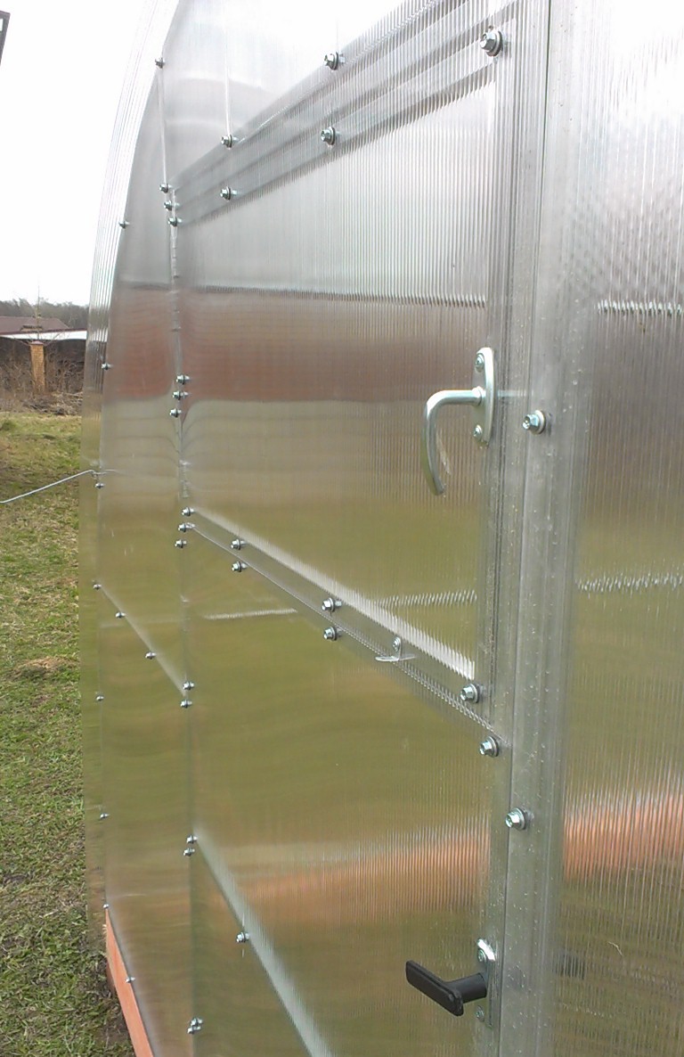 После того как теплица зашита поликорбонатом, остаются мелочи: крючки на двери, защелки на форточки, проверка соединений.
