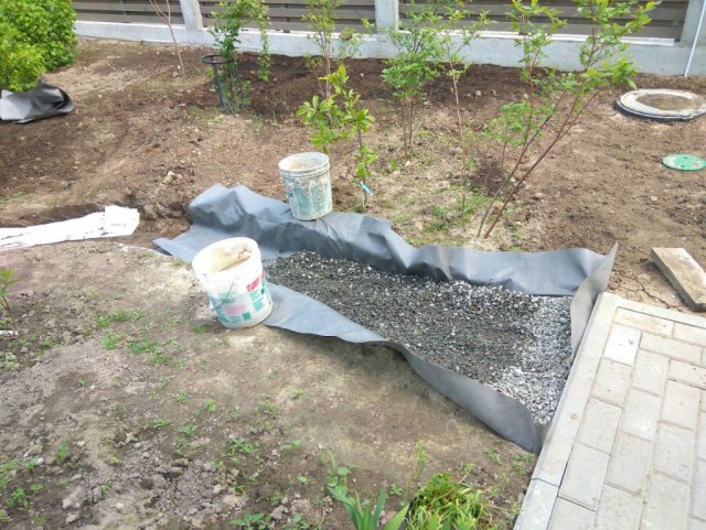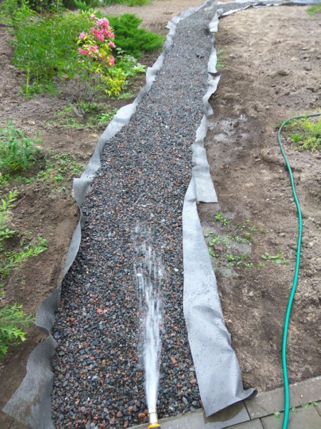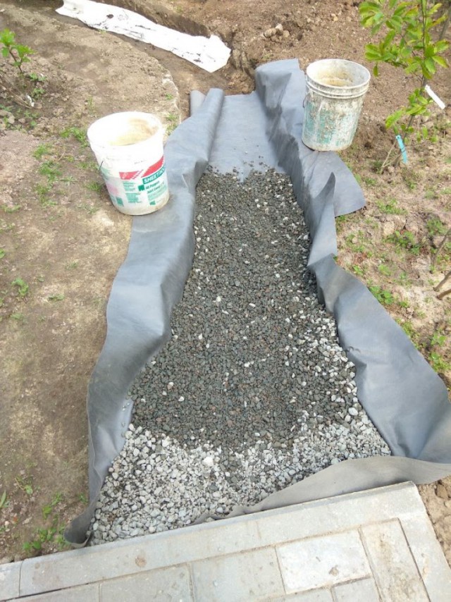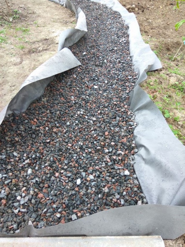 Затем на дно канавки выкладываем, выстилаем геотекстиль. Фактически это материал - ткань, которая не даст камням погружаться в грунт, но позволит воде проходить ниже.