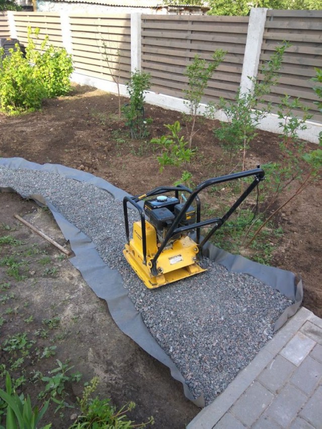 Теперь, если у вас есть машинка для утрамбовки, то пользуемся ей. Если таковой нет, то используем самодельный каток или просто вбиваем щебень с помощью деревянной чурки.