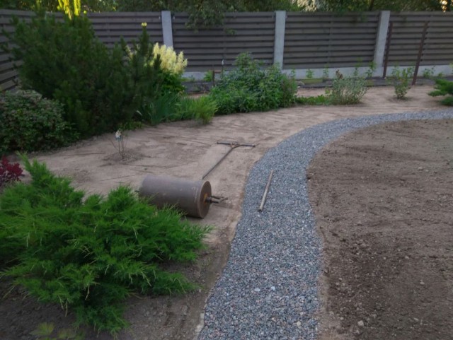 Так высыпаем щебенку по всей длине тропинки. Начинаем уплотнять тропинку. Для этого хорошо и обильно поливаем ее водой.