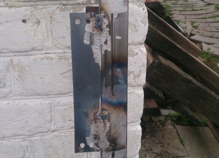 Для ручки калитки и замка привариваем металлическую пластинку. Делаем отверстия под крепеж.