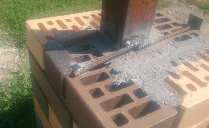 Теперь приступаем к возведению столбов под калитку. Столб выкладывается из кирпичей по 4 сторонам, а в центре столба установлена квадрат труба. При этом от этой квадрат трубы приварен стержень выходящий на противоположные стороны столба. К стержню приварены площадки или уголок. К этим элементам будут крепиться ворота, а с другой стороны калитка.