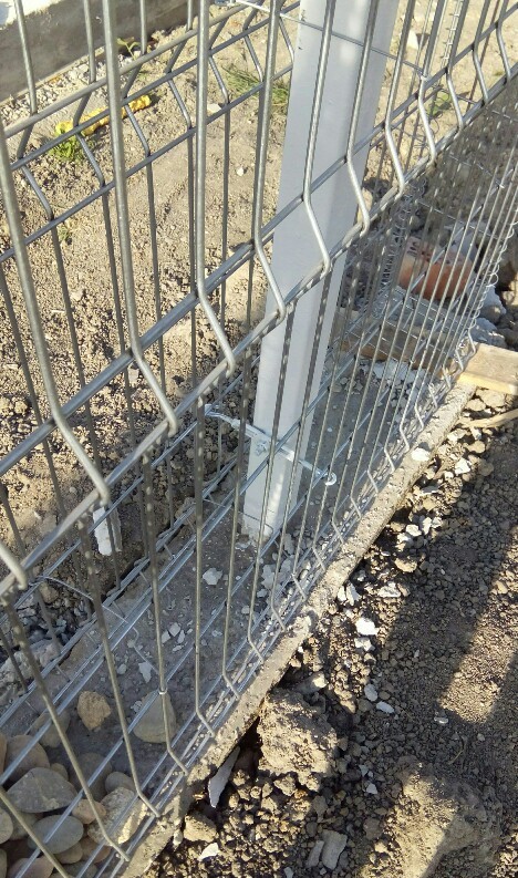 А да, конечно, необходимо между двумя сетками установить столбы. К столбам закрепить стяжки, которые и будут удерживать сетку. Столбы сами по себе забетонированы в землю. Между столбами также забетонирован бетонный пояс, хотя это не обязательно.