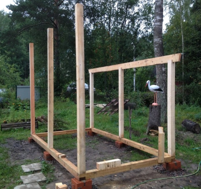 Начинаем все с фундамента. Он у нас на столбиках из кирпичей. Предварительно был снять верхний грунт, утрамбована почва и выложены столбики из кирпичей с обсыпкой щебнем. Здесь конечно не хватет еще гидроизоляции между брусом, который кстати 100*100 и столбиками, но вы это наверняка сделаете!