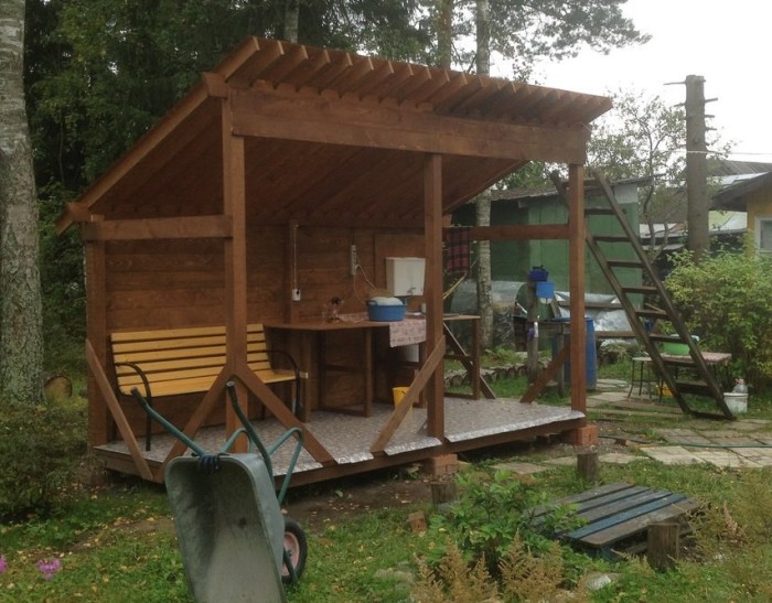 Проект летней кухни бюджетный и по силам каждому. Смонтировать такую кухню можно даже в одного, а сидеть на ней могут целой компанией. Кстати, использовать такую постройку можно и для посиделок. Достаточно поставить столик и позвать гостей.