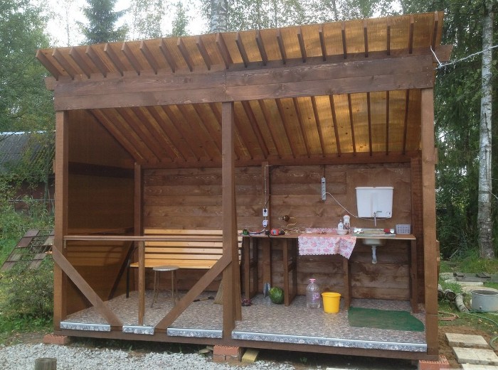 Тут же смонтирована умывальник и раковина. Сзади летней кухни выкопан небольшой септик с естественной аэрацией в почву на глубине около 1,5 метров.