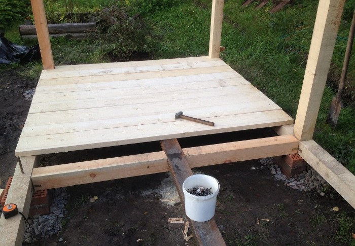 Сам брус скреплен между собой пазами, уголками и металлическими стержнями. Смотрите фотографию. После выставляем стойки под крышу и зашиваем пол доской. Доска в 40 мм. Пила, гвозди и молоток. Этого вполне достаточно.