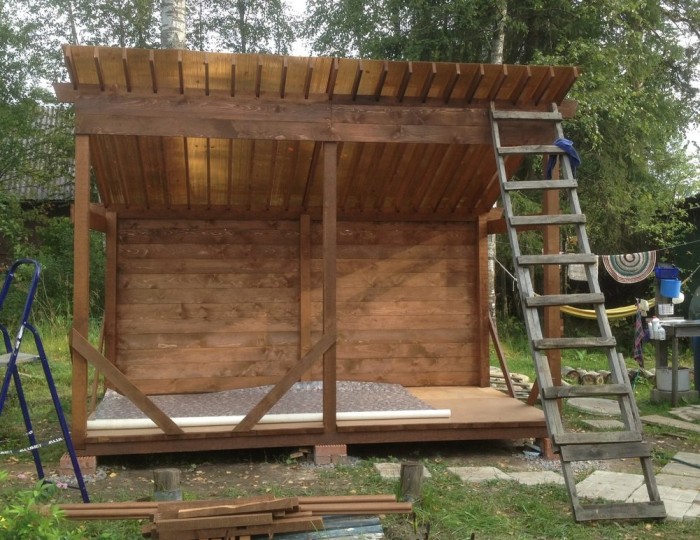Зашиваем еще одну стенку поликарбонатом. Теперь все выглядит примерно вот так. Несем электрическую плитку и магнитофон, тогда и вовсе будет все на своих местах.