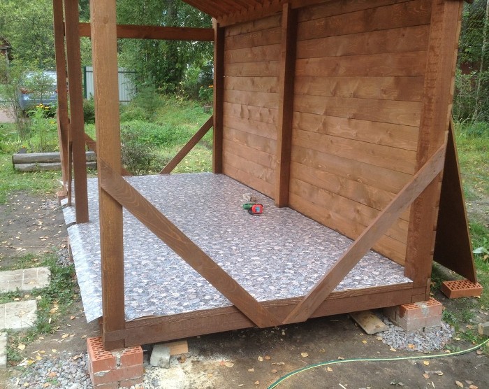 Чтобы была возможность следить за чистотой, стелем линолеум. На сгибе крепим уголком.